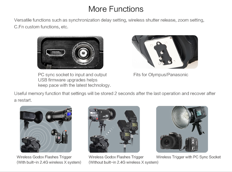 Появляется возможность работы с дополнительными функциями, такими как: задержка синхронизации, беспроводной спуск затвора, управление зумом. Сокет для PC синхронизации для входящих и исходящих данных.