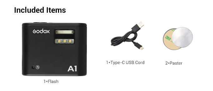 Godox A1 питается от встроенной литиевой батареи 3,8V 1000mAh, которая обеспечивает до 700 срабатываний на полной мощности, присутствует индикатор заряда. На нижней части A1 располагается стандартное крепление для штатива 1/4". Зарядка устройства производится через USB Type-C разъем.