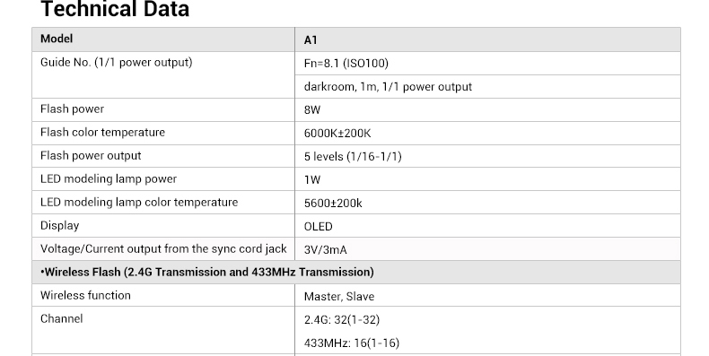 Вспышка Godox A1 обладает импульсной лампой 8W с цветовой температурой 6000К (+/- 200K) и моделирующей Led лампой мощностью 1W и цветовой температурой 5600K(+-200K). Мощность вспышки регулируется в пределах 5 шагов от 1/1 до 1/16.